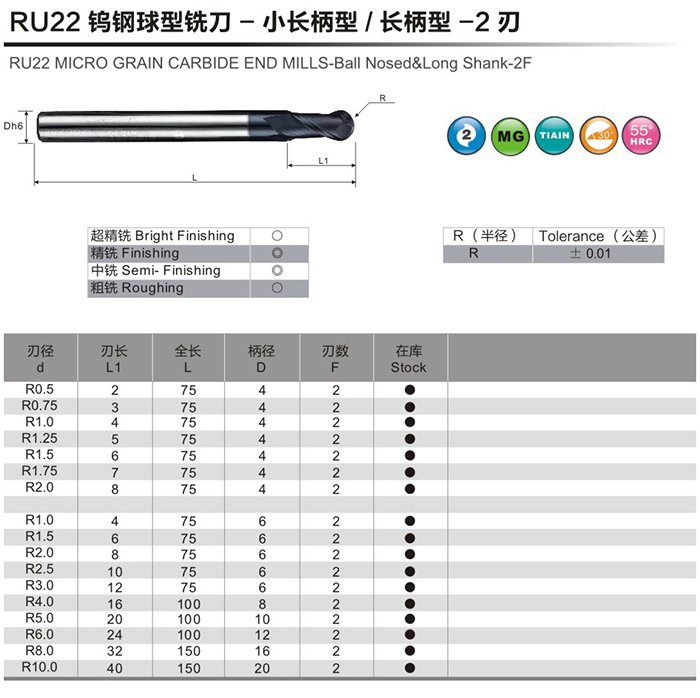 RU22鎢鋼球型銑刀-小長(zhǎng)柄型/長(zhǎng)柄型-2刃