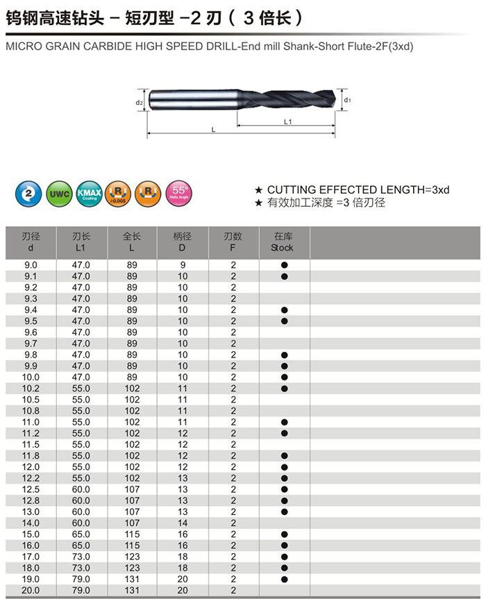 鎢鋼高速鉆頭-短刃型-2刃(3倍長)